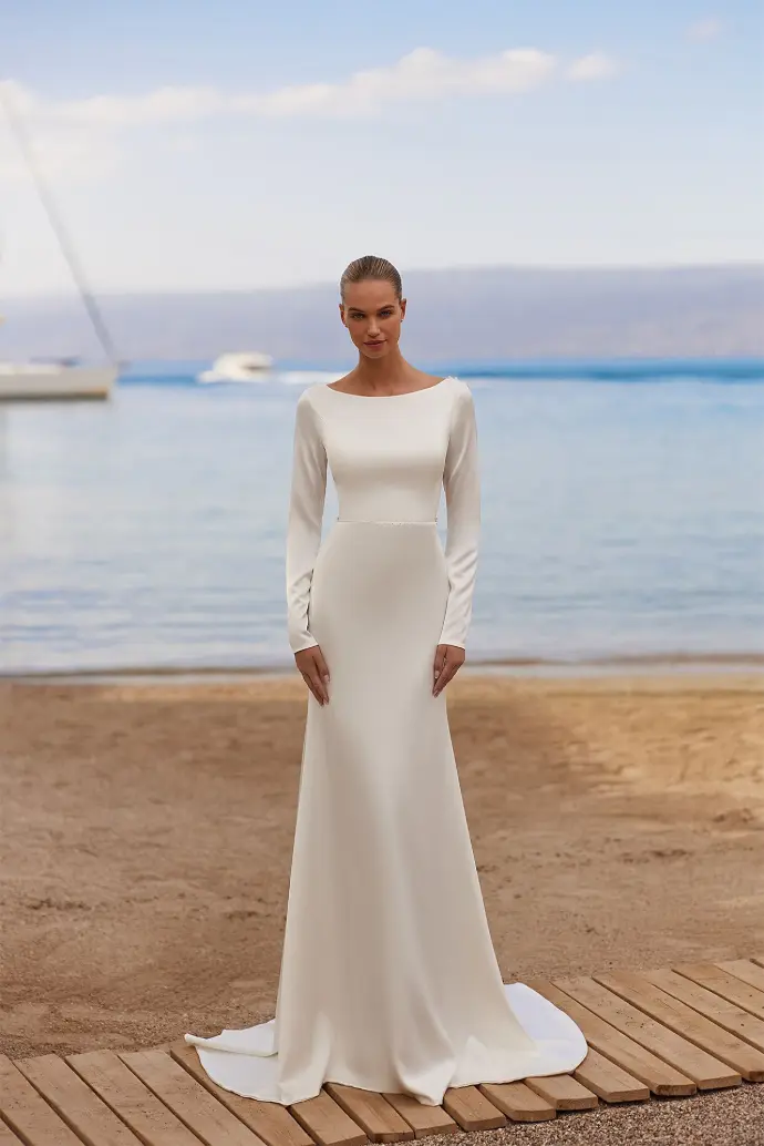 Simplicity meets surprise in the effortlessly elegant gown. Crafted in buttery crepe, this fitted silhouette features a minimalist bateau neckline and long sleeves that exude timeless sophistication.