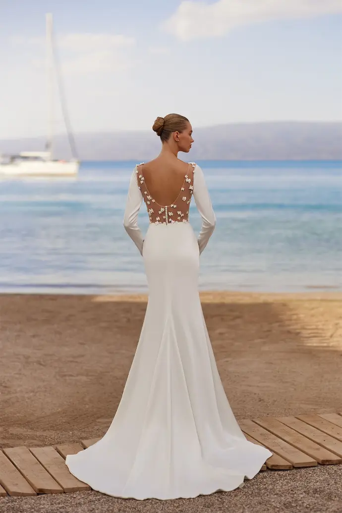 The magic lies in the back—a sheer illusion panel adorned with delicate 3D bows, offering a playful yet refined touch. A soft train completes the look, creating a gown that’s both modern and unforgettable. Perfect for the bride who loves clean lines with an unexpected twist.