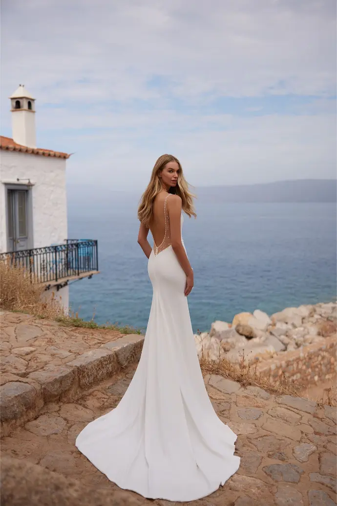 Clean, demure lines at the front enhance its understated elegance, while subtle architectural draping or gentle pleats add visual interest and movement without overwhelming the design. A delicate train completes the ensemble, offering quiet drama with every step. Designed for the modern bride seeking timelessness and purity, Vela radiates confident refinement and softer femininity in perfect balance.